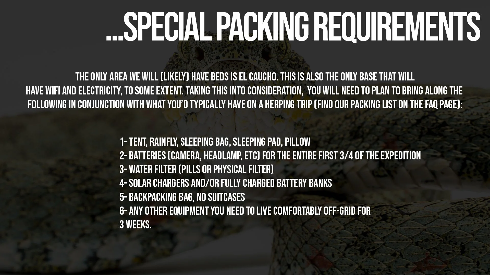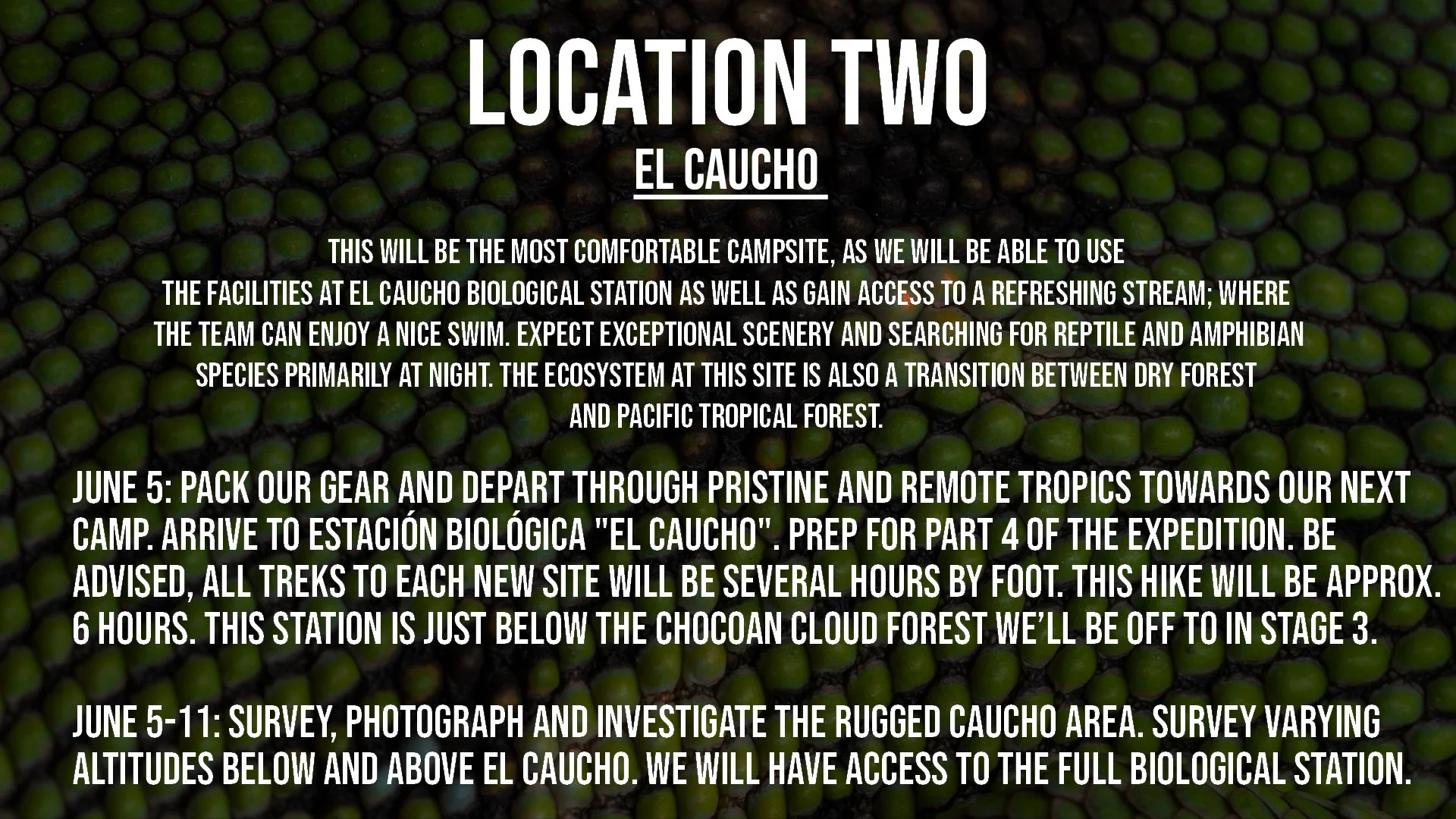Our expedition will take place across 4 different bases of operation, which you can learn more about below. We will have a cook, campsite (bring your tents!), and field lab throughout the trip. Our second location (El Caucho) will potentially have beds, and we will likely be able to enjoy Wi-Fi (gross) and electricity here. Our final location (Cotrina) has never been formally surveyed for herpetofauna. While this is not a touristic project, you will have comfortable access to all basic necessities with some proper packing. You will undoubtedly be a crucial part of the most rigorous and remote expedition Serpentine has ever hosted.