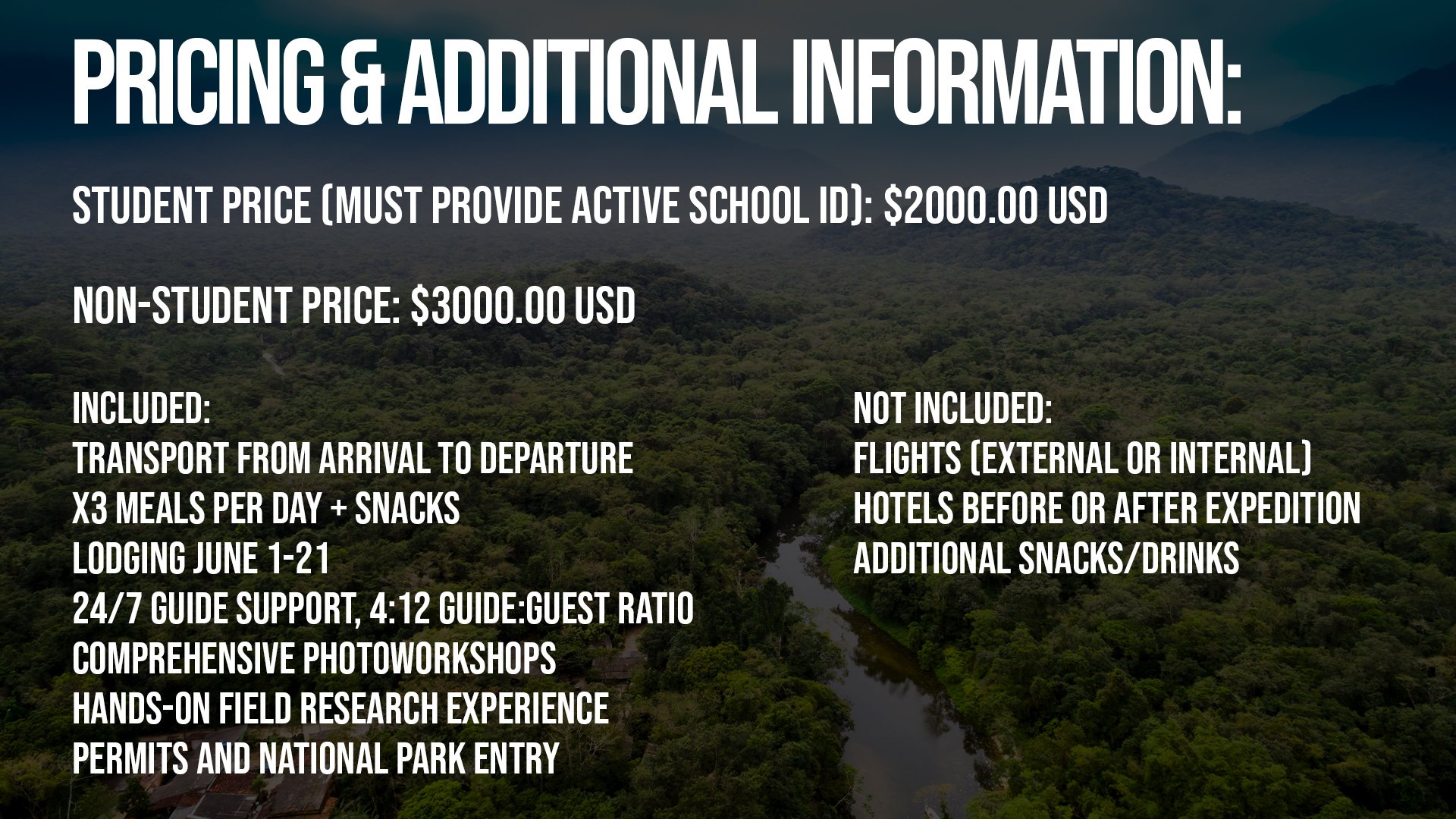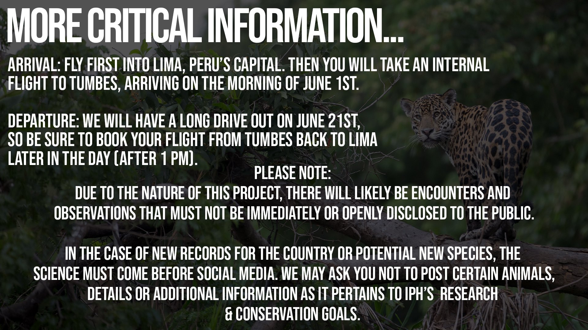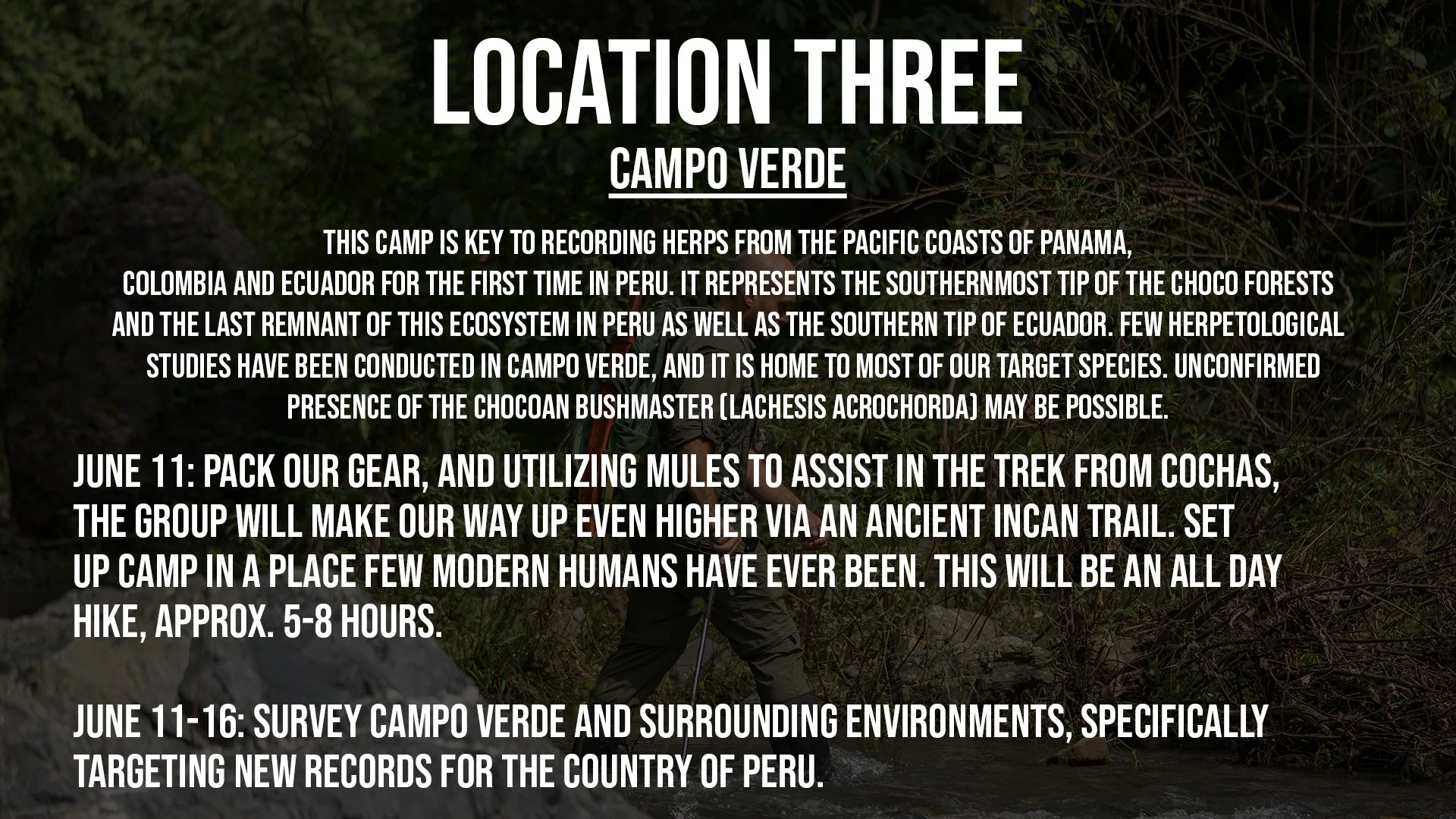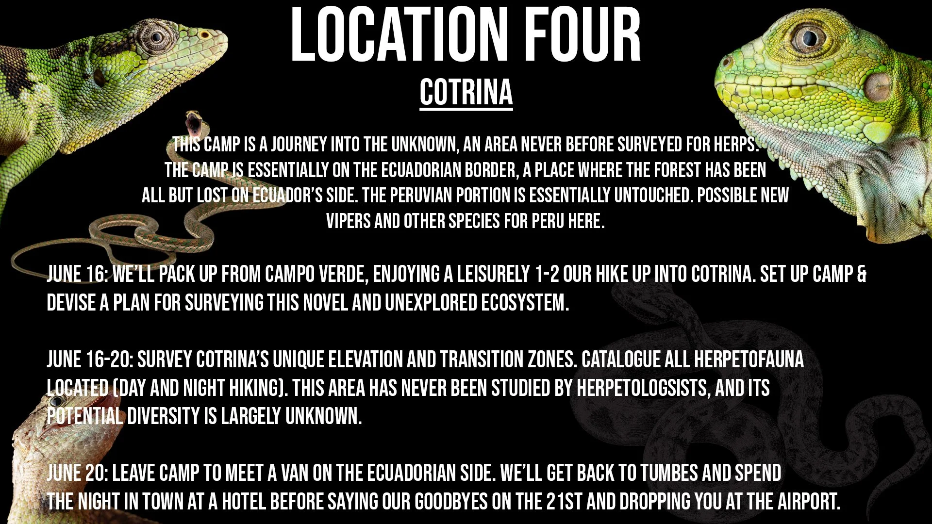 During our research expedition, a group of up to 12 guests will join IPH’s President & Co-founder Pablo Venegas, Associate Researcher Michael Gulman, Serpentine Co-Founder & Guide Ian Breland, as well as other supportive elements in the field. You will fly into Lima, Peru’s capital city. From there, we hop on a plane bound for Tumbes, a town on the Peru/Ecuador border. We’ll transfer immediately out of the city; bound for 3 weeks of dry forest, Chocó cloud forest, Pacific rainforest and transition zone exploration.