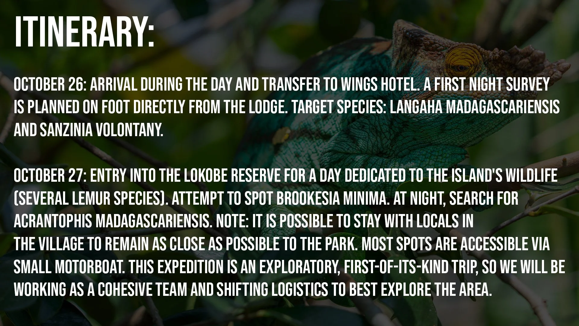 From the coastal and reef-influenced systems of Nosy Be to the humid montane gradients of Amber Mountain National Park and the intact elevational transects of Marojejy National Park, this expedition samples high-endemism assemblages across THE sharply structured habitats and microclimates THROUGHOUT northern Madagascar. WE WILL ENCOUNTER MANY SPECIES YOU’VE LIKELY NEVER EVEN HEARD OF.