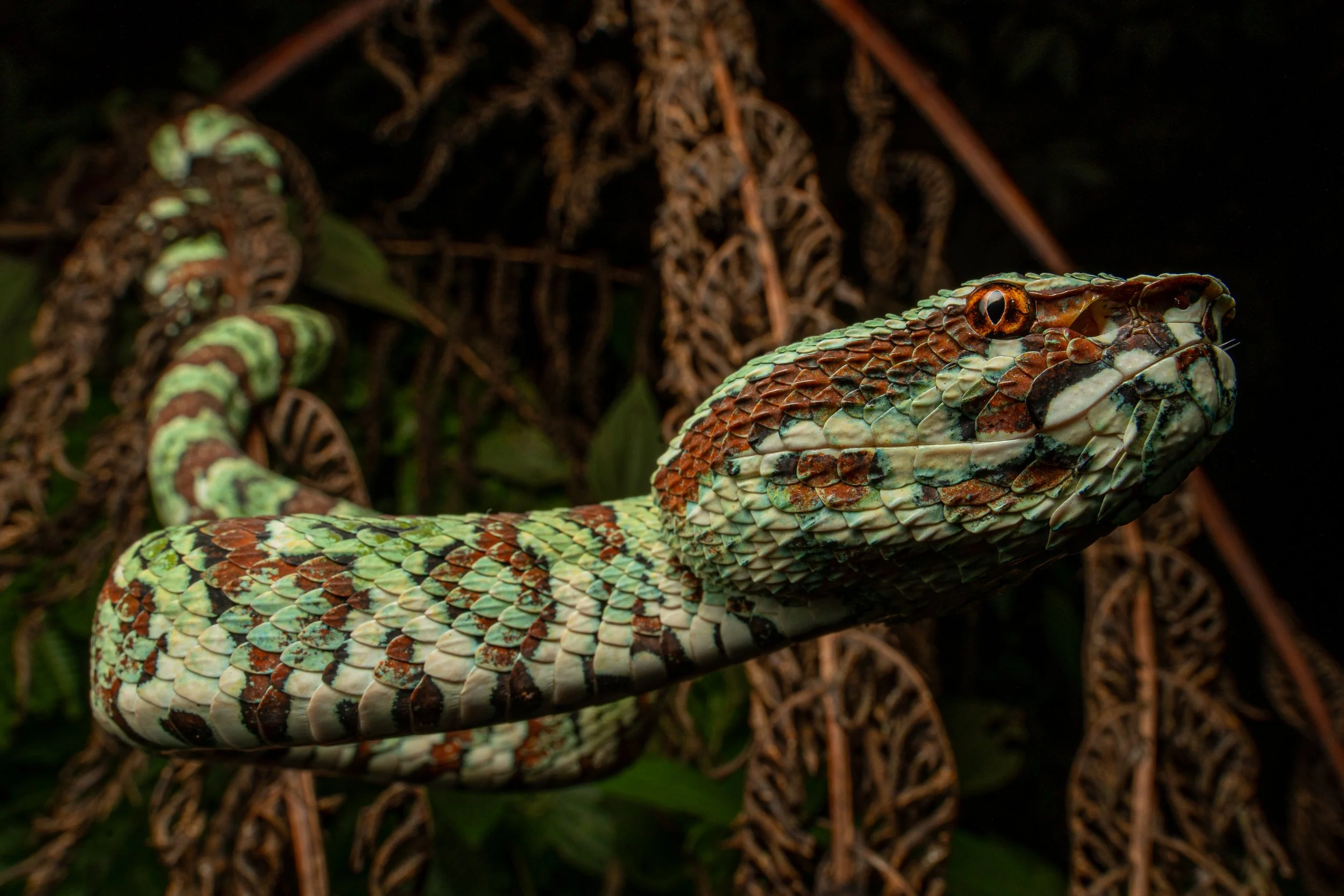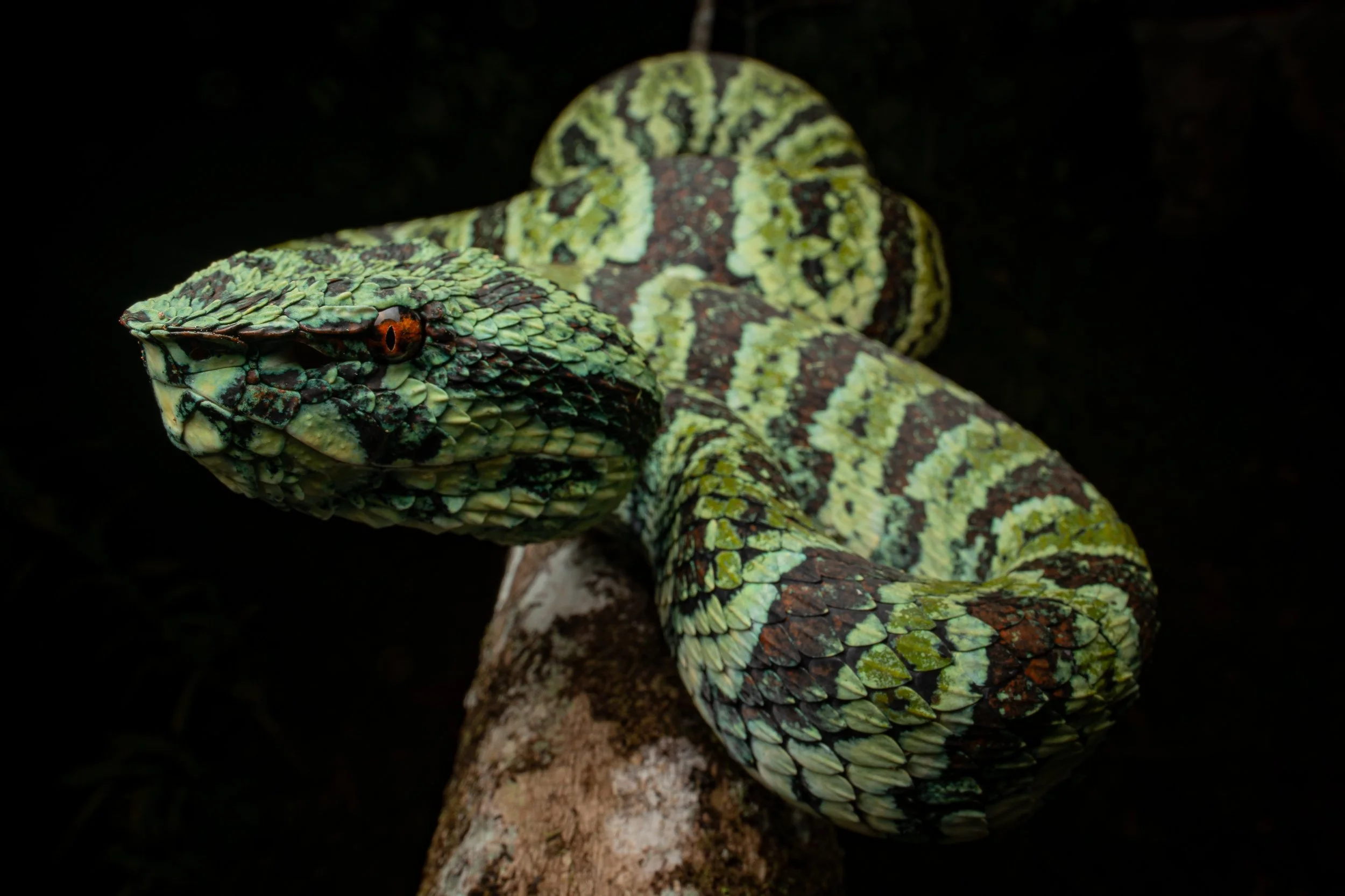 Our primary terrestrial target in Sulawesi, the imperiled and astonishingly beautiful broad-banded temple pit viper (Tropidolaemus laticinctus).