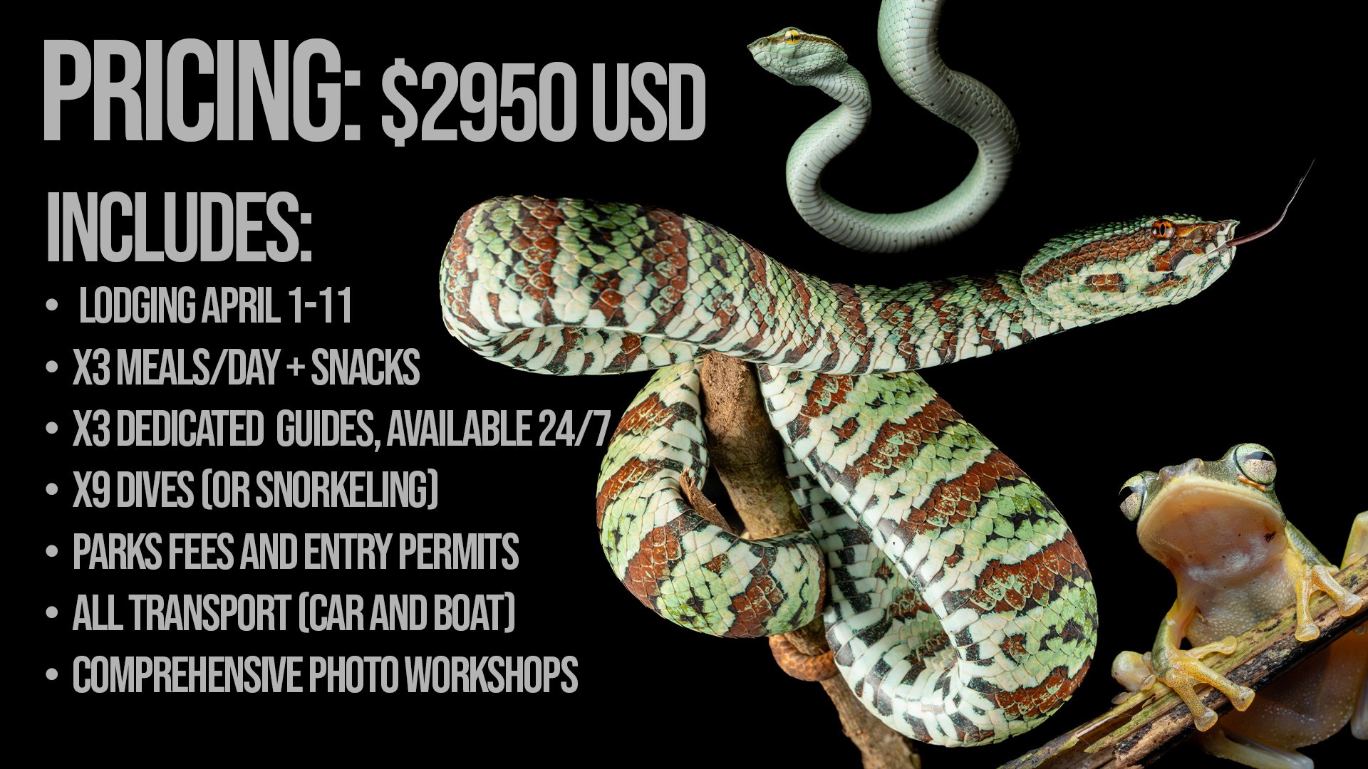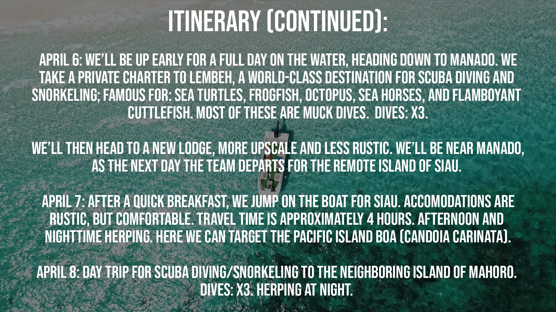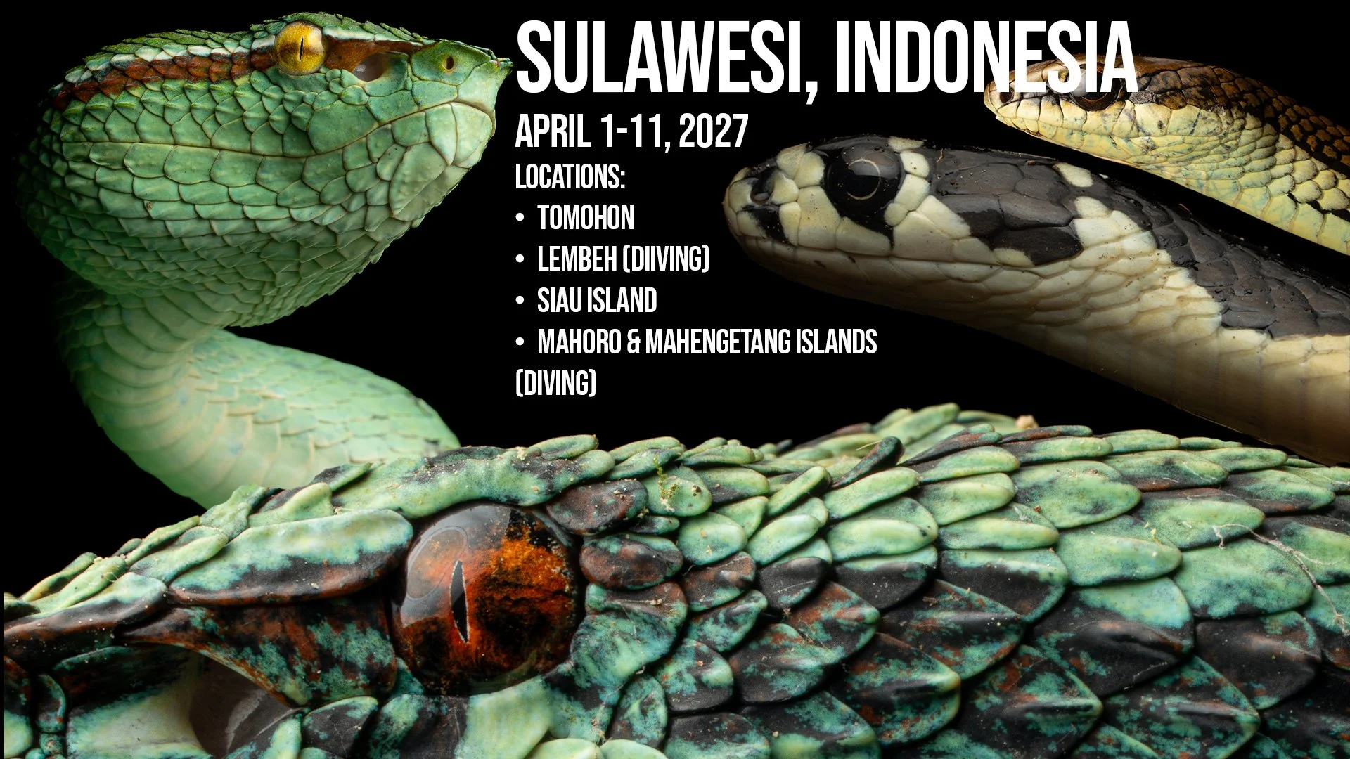 *THIS IS A DIVING AND HERPING EXPEDITION. YOU DO NOT NEED ANY CERTIFICATIONS TO SNORKEL WHILE OTHERS DIVE! north SULAWESI IS AN INTERNATIONALLY CHERISHED DIVING LOCATION, boasting 8-10 sea snake species present in it’s waters, as well as 5 sea turtle species.*