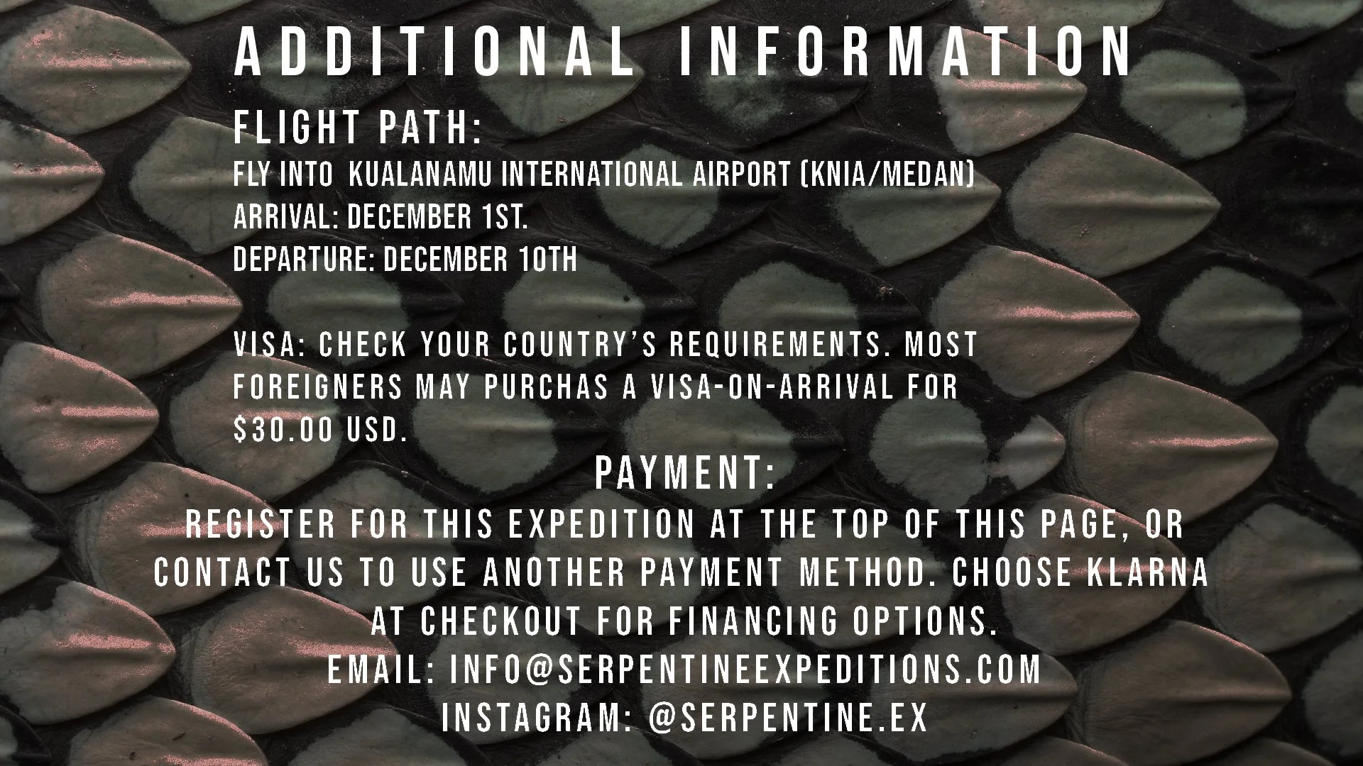 Working with our local partners at Sumatra Eco Project, this adventure will take us first into the environments surrounding Bukit Lawang, then neighboring Tengulun, and critically- one of Sumatra’s last surviving coastal mangrove habitats, Karang Gading. We will target herps such as the king cobra, mangrove pit viper, red-headed krait, striped & blue coral snakes, reticulated pythons, wagler’s pit viper, and the Sumatran spitting cobra. Additional mammalian targets include the Sumatran elephant, Sumatran orangutan, sun bears, siamang gibbons, Thomas leaf nose monkeys, silver leaf langurs, Sunda pangolin, binturong, colugos, and slow loris. After the thrill of Sumatra, we’re adding an optional secondary adventure to Komodo National Park from Dec. 10-16. Keep scrolling for more info and a link to the Komodo-specific portion of this trip.
