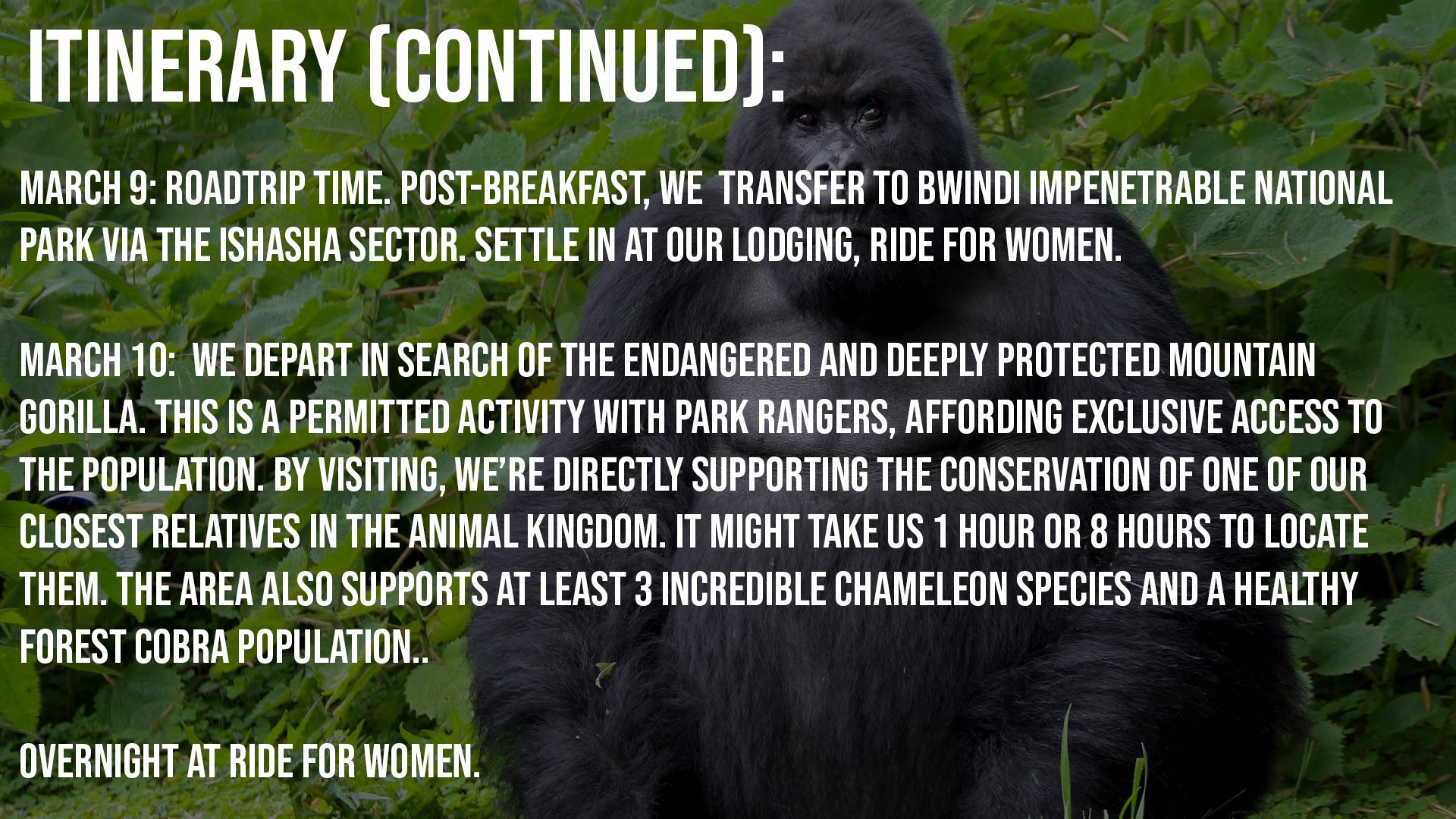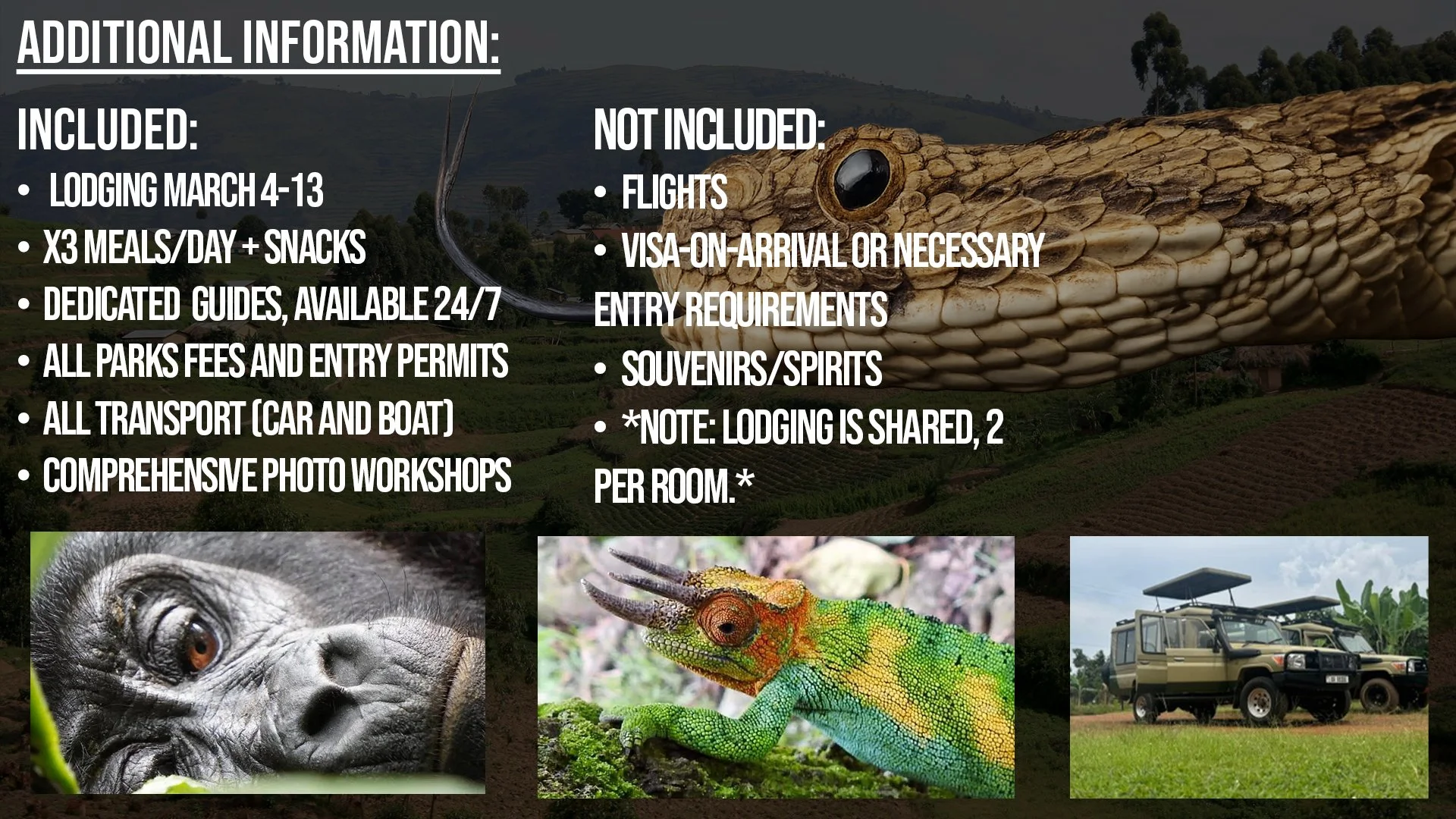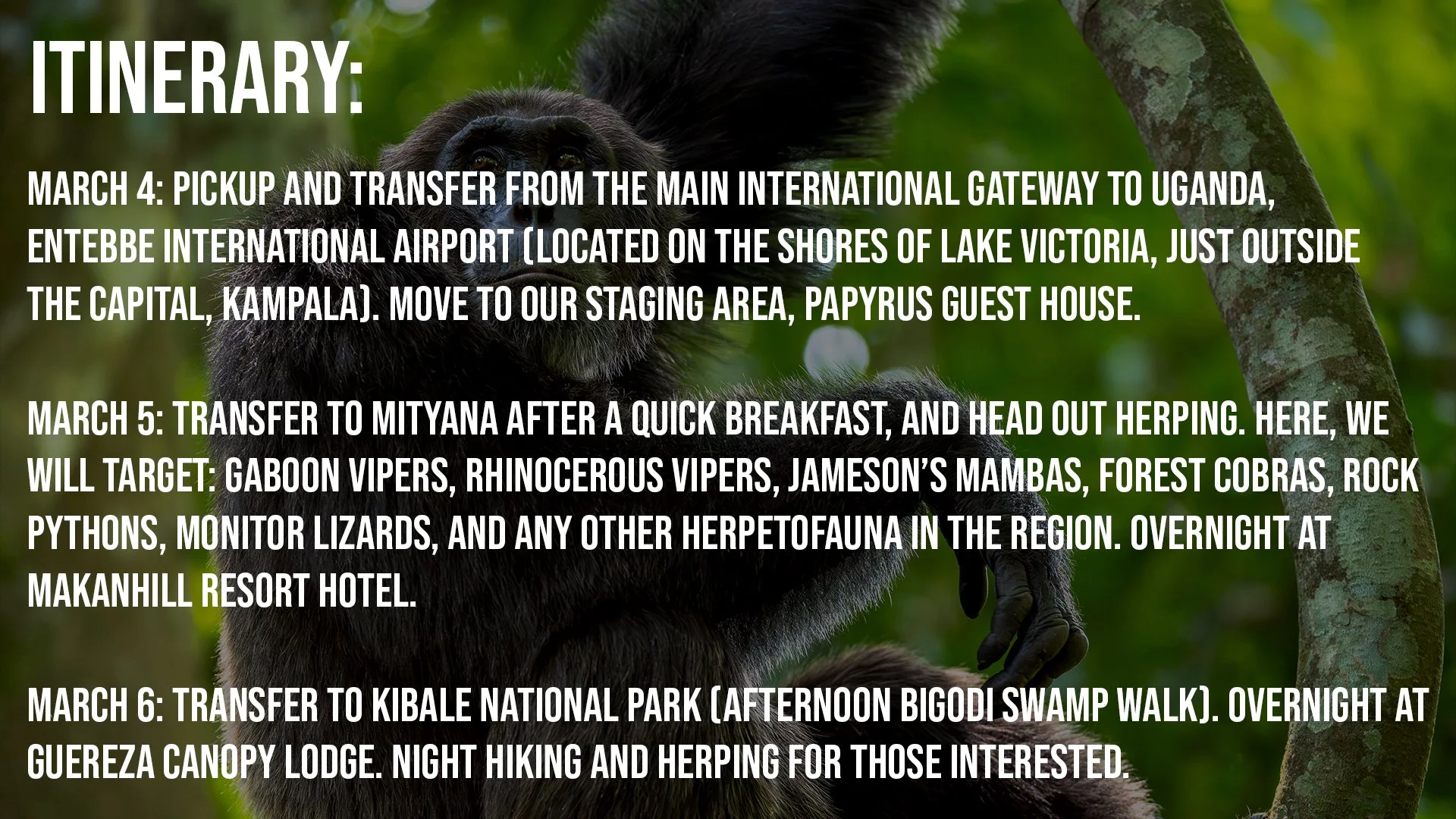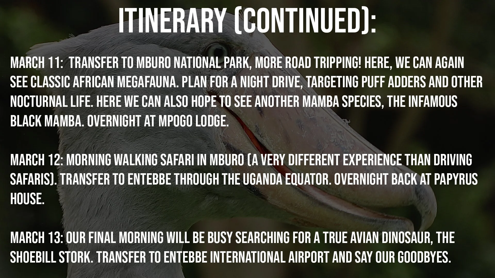 On this expedition, we’ll course through six different locations, all unique in their own special ways. This includes lowland savannah habitat, moist woodland, submontane tropical rainforest, and montane cloud forest ecosystems. Our search for life here will center around chimpanzees, gorillas, lions, Nile crocodiles, gaboon vipers, rhinoceros vipers, Jameson’s mambas, chameleon diversity, and the shoebill stork (if you’ve never heard of this bird, you’re in for a treat).