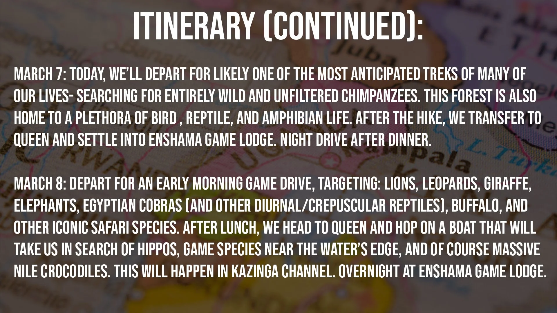 A GLIMPSE INTO OUR LODGING AT ENSHAMA GAME RESERVE AND Guereza Canopy (Kibale National Park).
